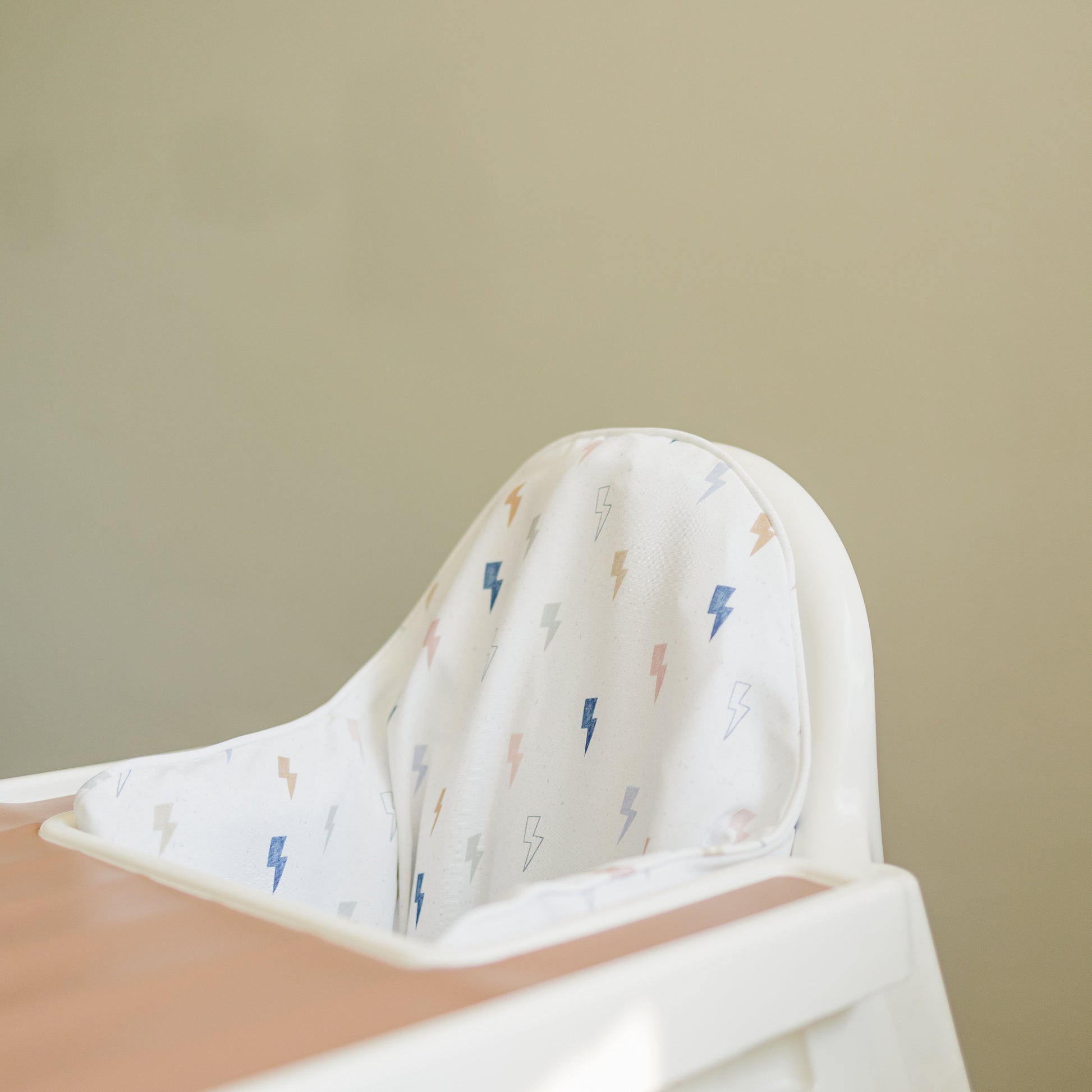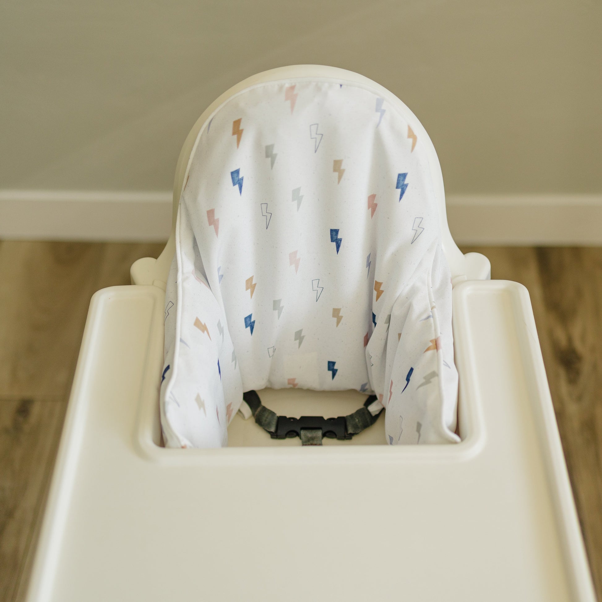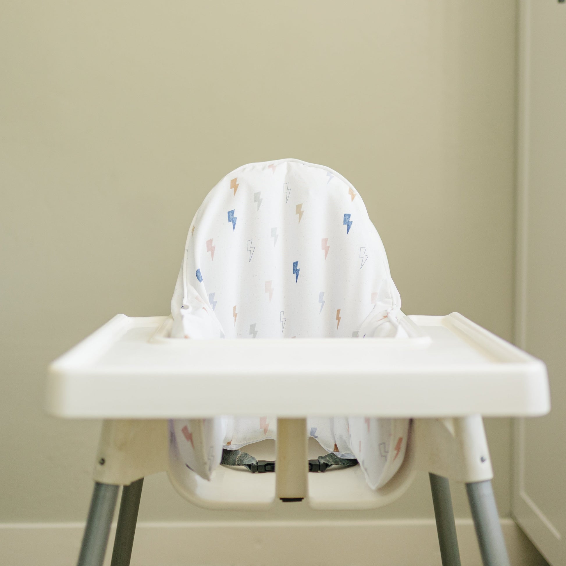 A fun multi color lightning bolt print! Wipeable cushion cover for the IKEA Antilop Highchair