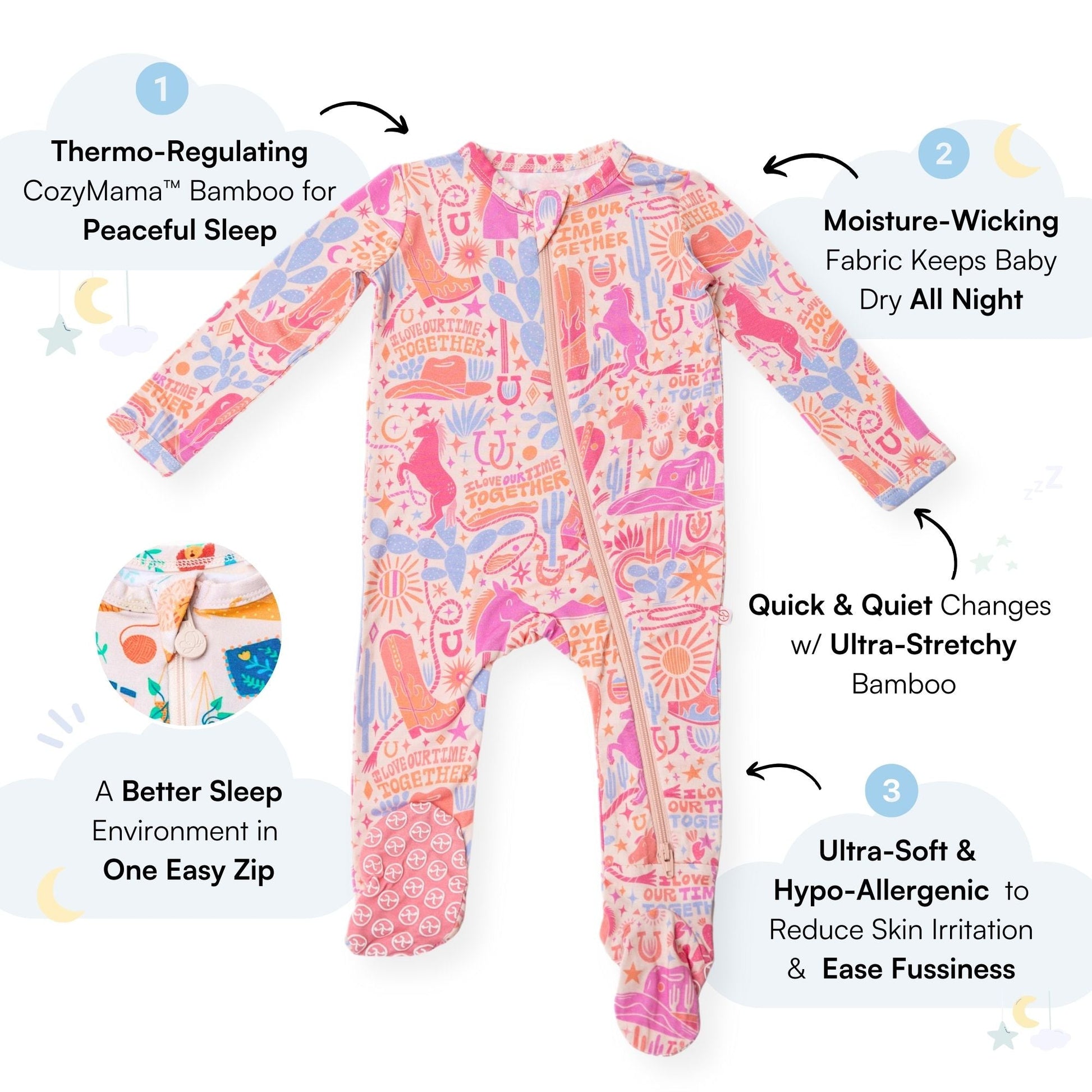 Designed with ultra-soft CozyMama® viscose from bamboo, our bamboo baby pajamas can be rocked day and night, featuring a 2-way zipper, 5% thicker and more durable fabric, and larger wrist and ankle openings that make diaper changes and after bathtime frustration-free.